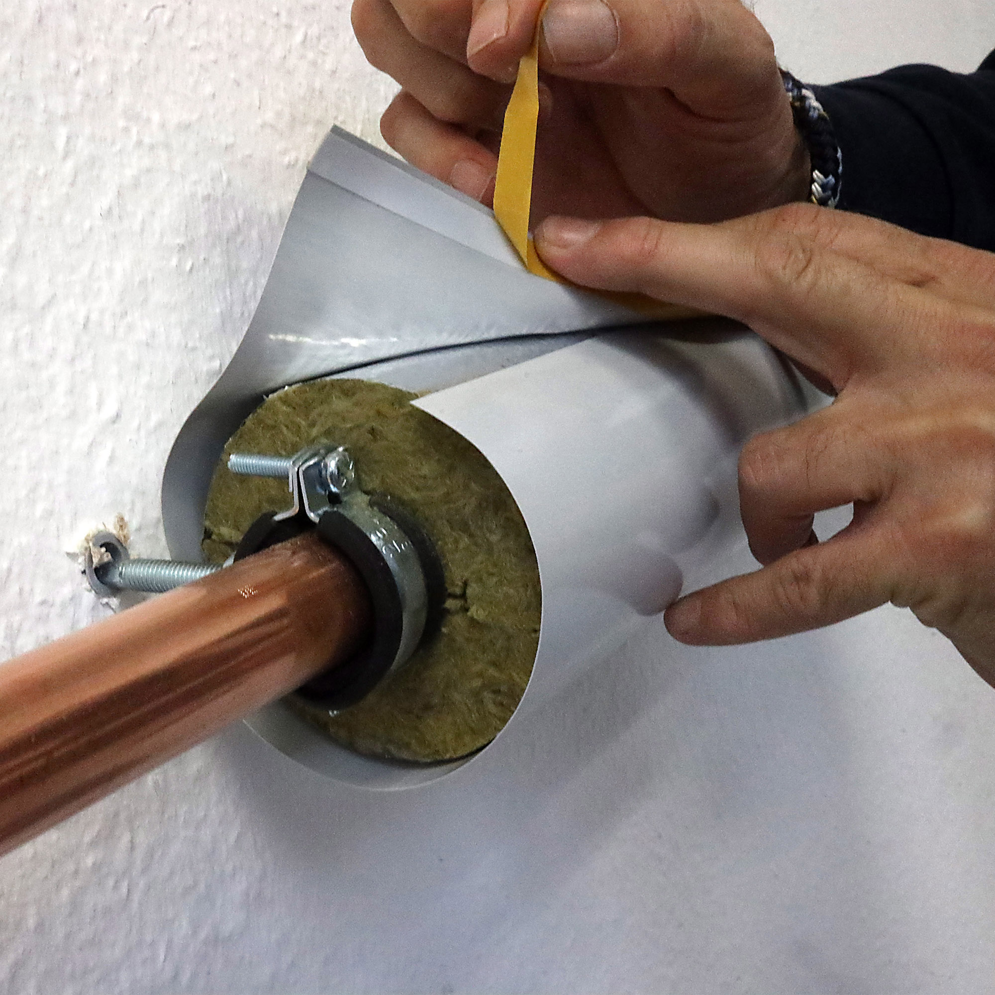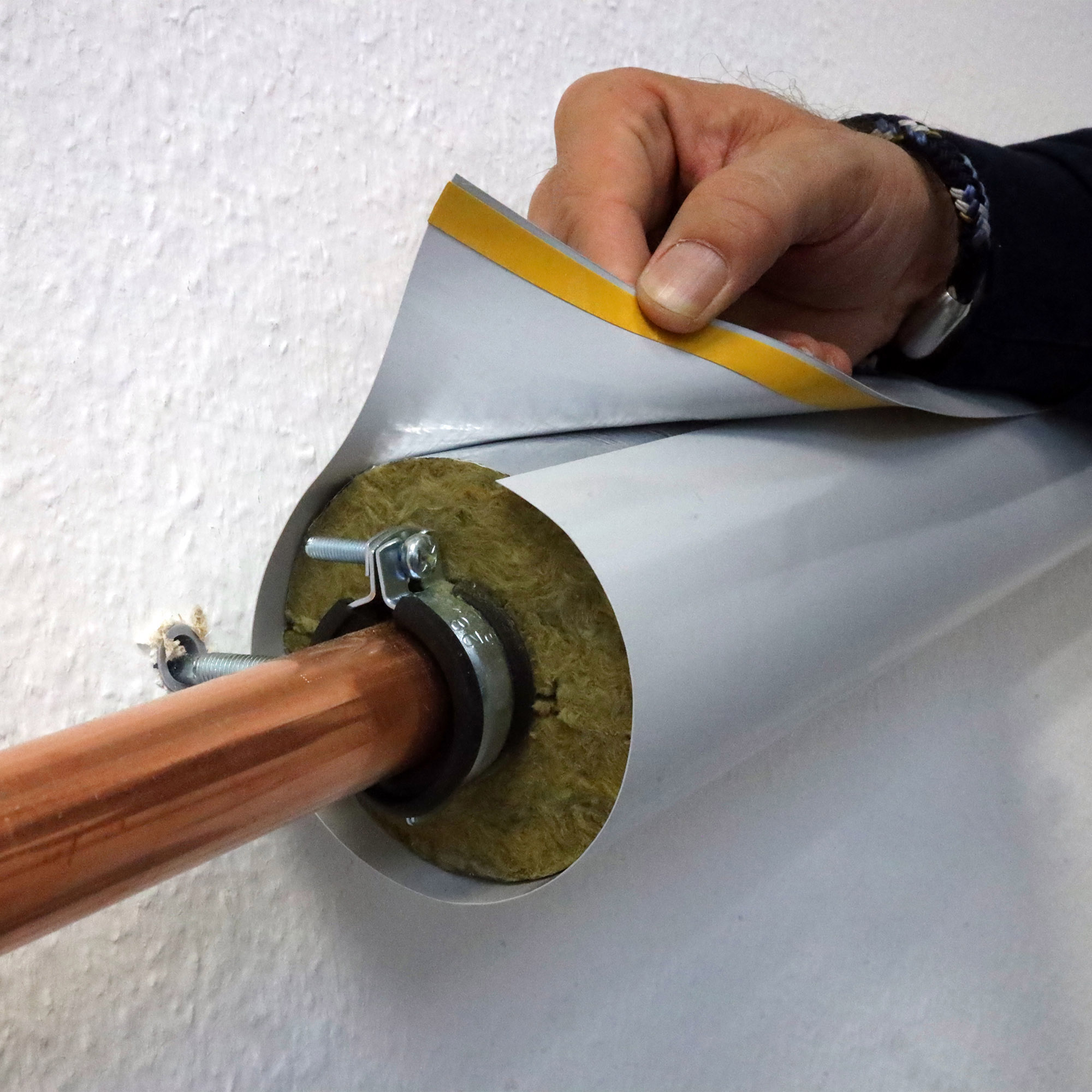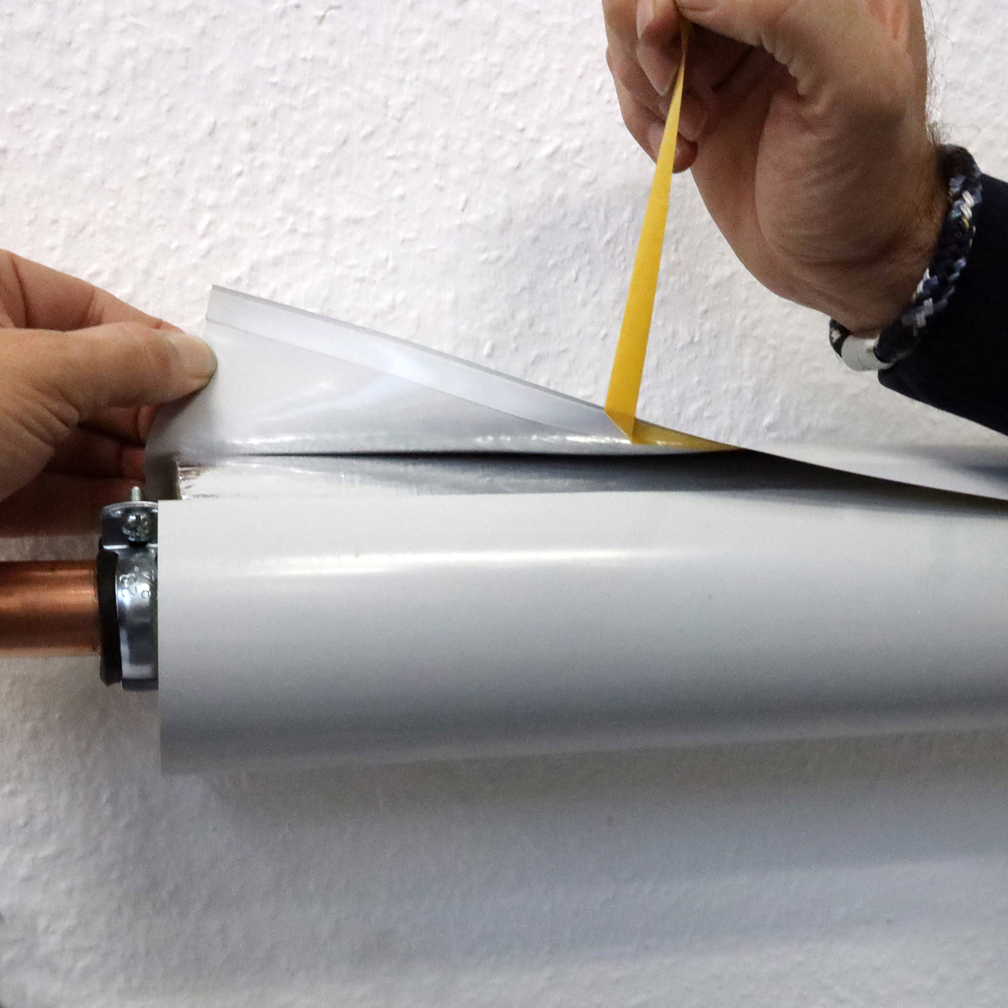Die fertigen selbstklebenden PVC-Folienzuschnitte haben bereits eine Überlappung von 3 cm und können sofort um das isolierte Rohr gelegt werden. Anschließend werden die Isolierstöße mit unserem PVC-Klebeband hellgrau (in den Breiten 19 mm, 25 mm oder 50 mm) verklebt.