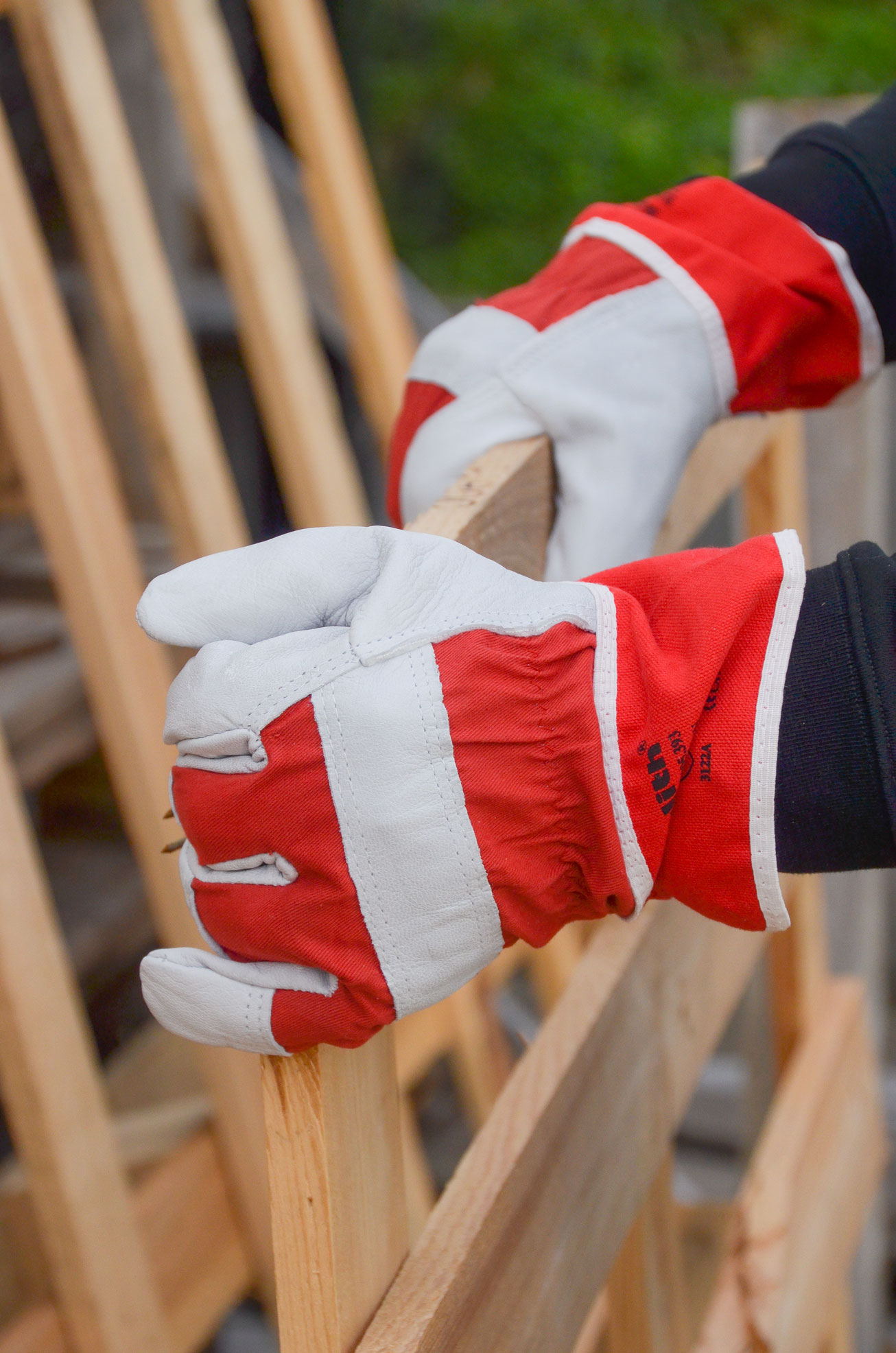 Hochwertige und sehr robuste Profi Arbeitshandschuhe für das Handwerk und Industrie aus naturgrauem Vollleder, doppelte Nähte, Zeigefinger ganz aus Leder, roter 10 Unzen Canvasrücken- und sicherheitsstulpe, Gummizug auf dem Handrücken, Knöchel- und Pulsschutz, EN 420 & 388.