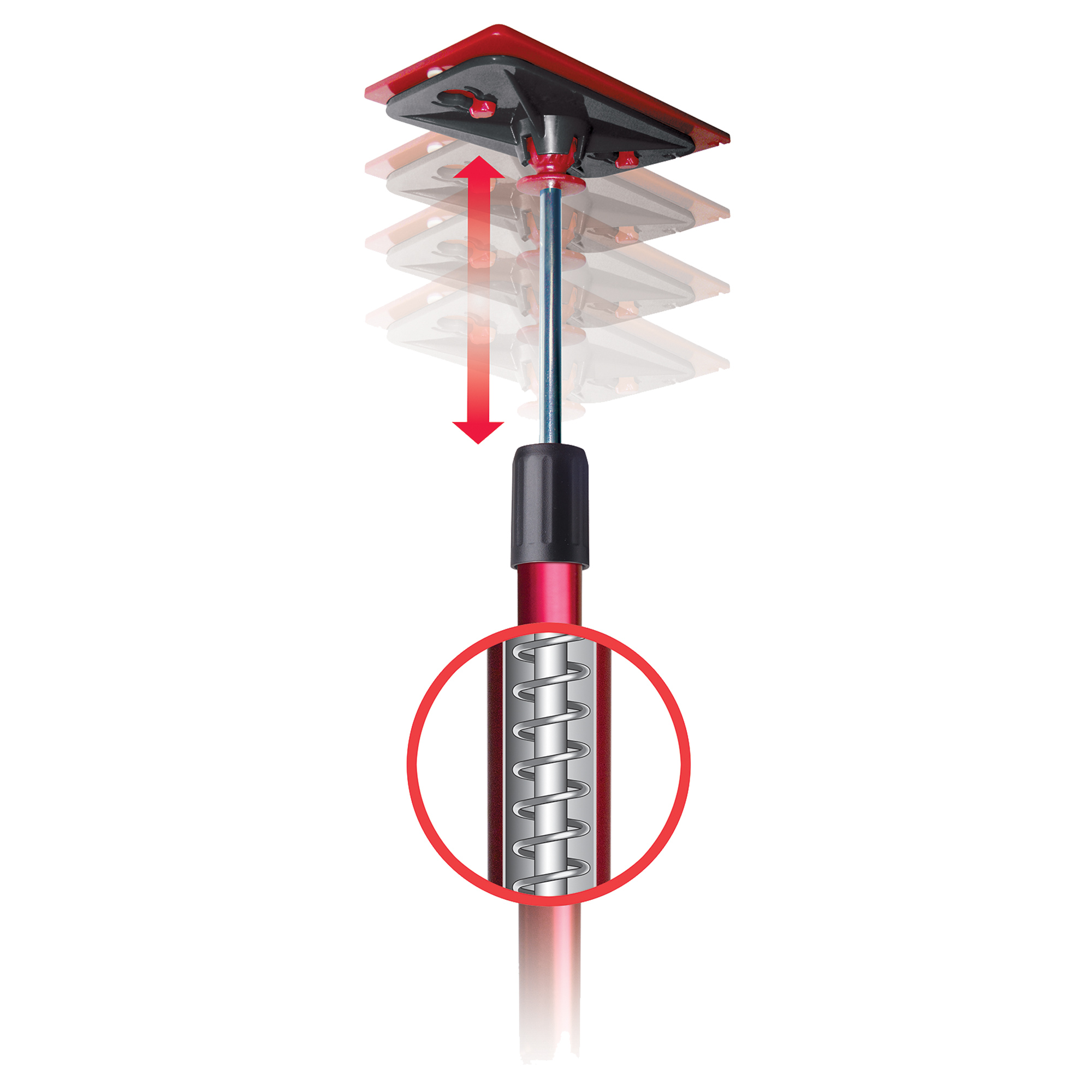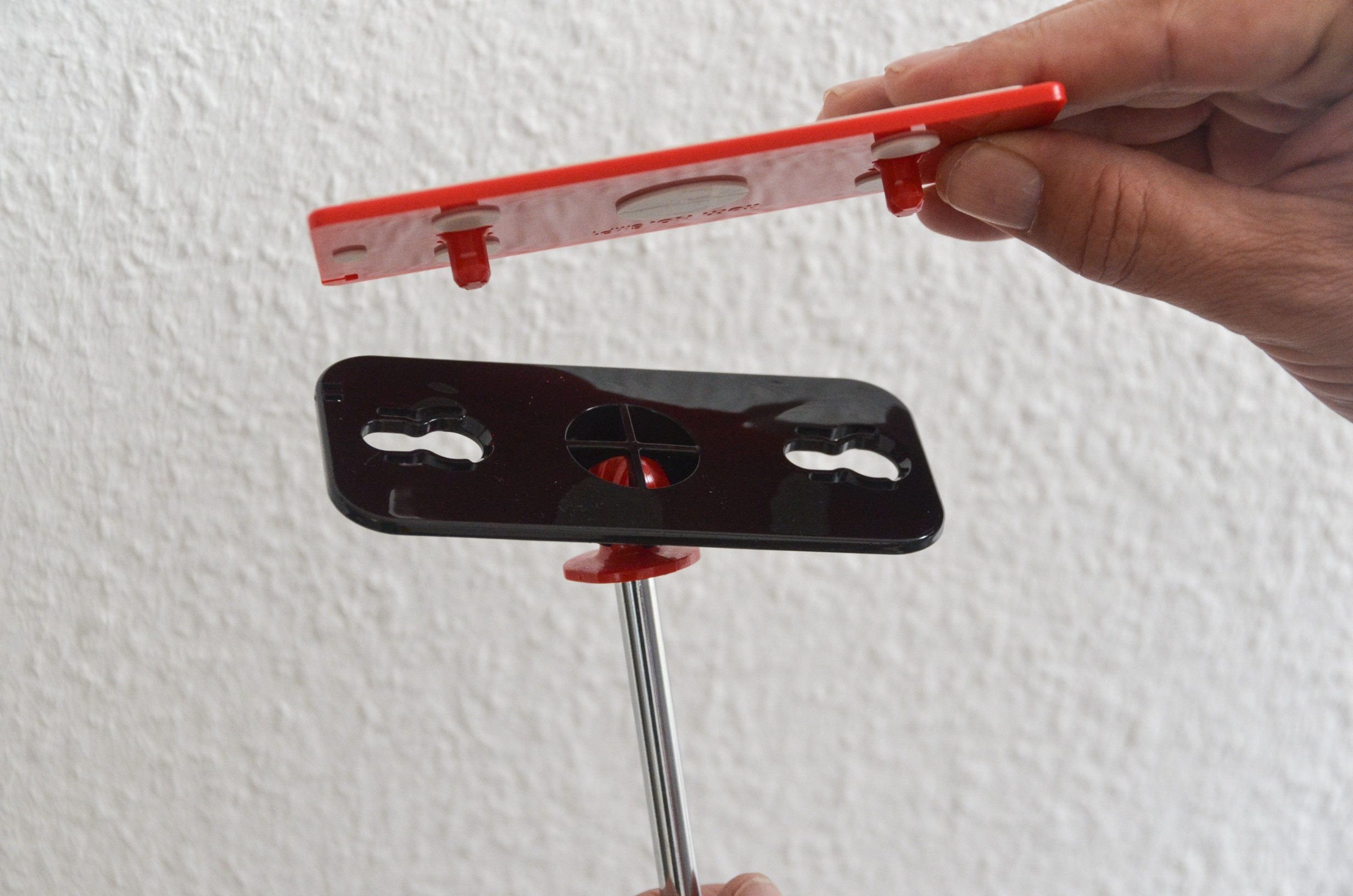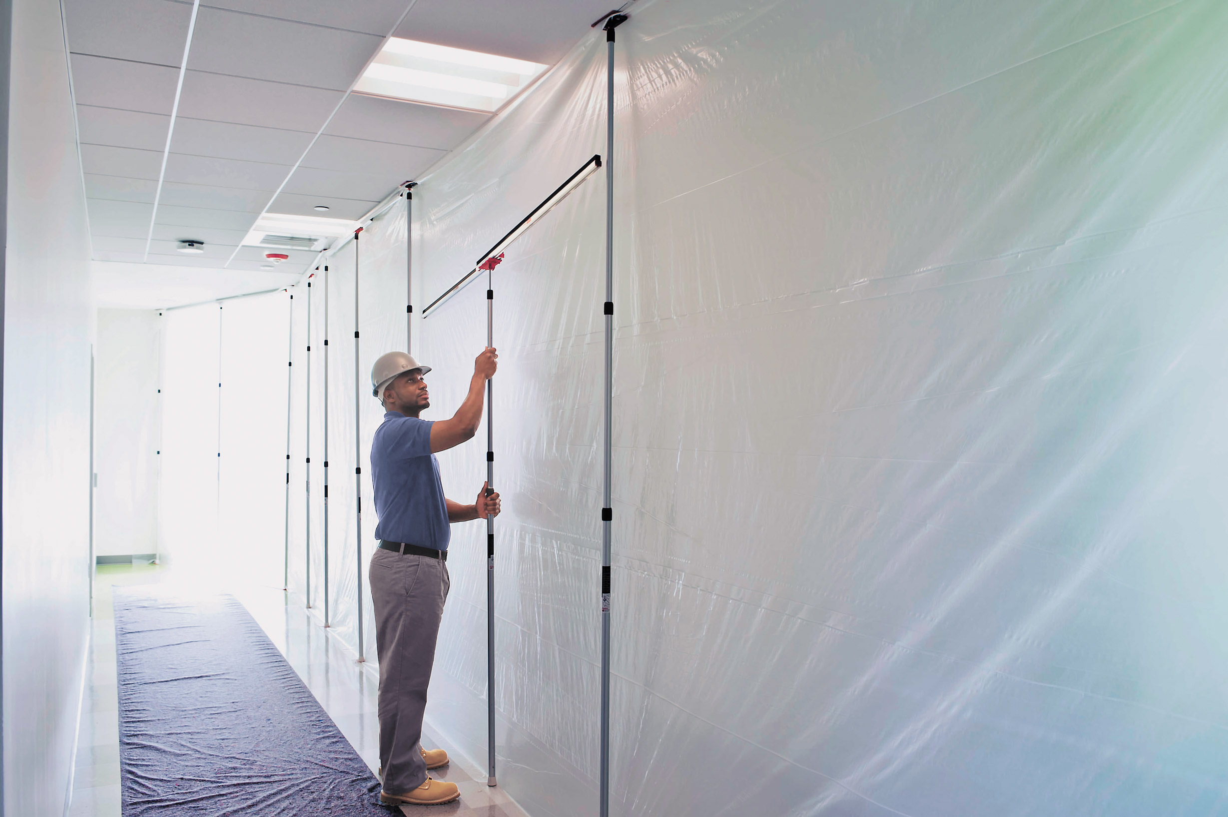 Die Aluminium-Teleskopstangen sind druckgefedert und können optimal und stabil zwischen Boden und Decke gespannt werden. Jede Teleskopstange ist mit einer rutschfesten Kopfplatte zum Befestigen der Folie ausgestattet. Die Staubschutzfolie kann aufgrund der Fixierung in der Kopfplatte ohne Leiter nach oben an die Decke verspannt werden. Mit der nächsten Teleskopstange (wie zuvor beschrieben) wird die Breite der Staubschutzwand, am besten im Abstand von 2,50 m, verspannt. Durch die Flexibilität kann die ZipWall® Staubschutzwand als gesamte Länge/Breite oder als L-Form oder U-Form gestellt werden.