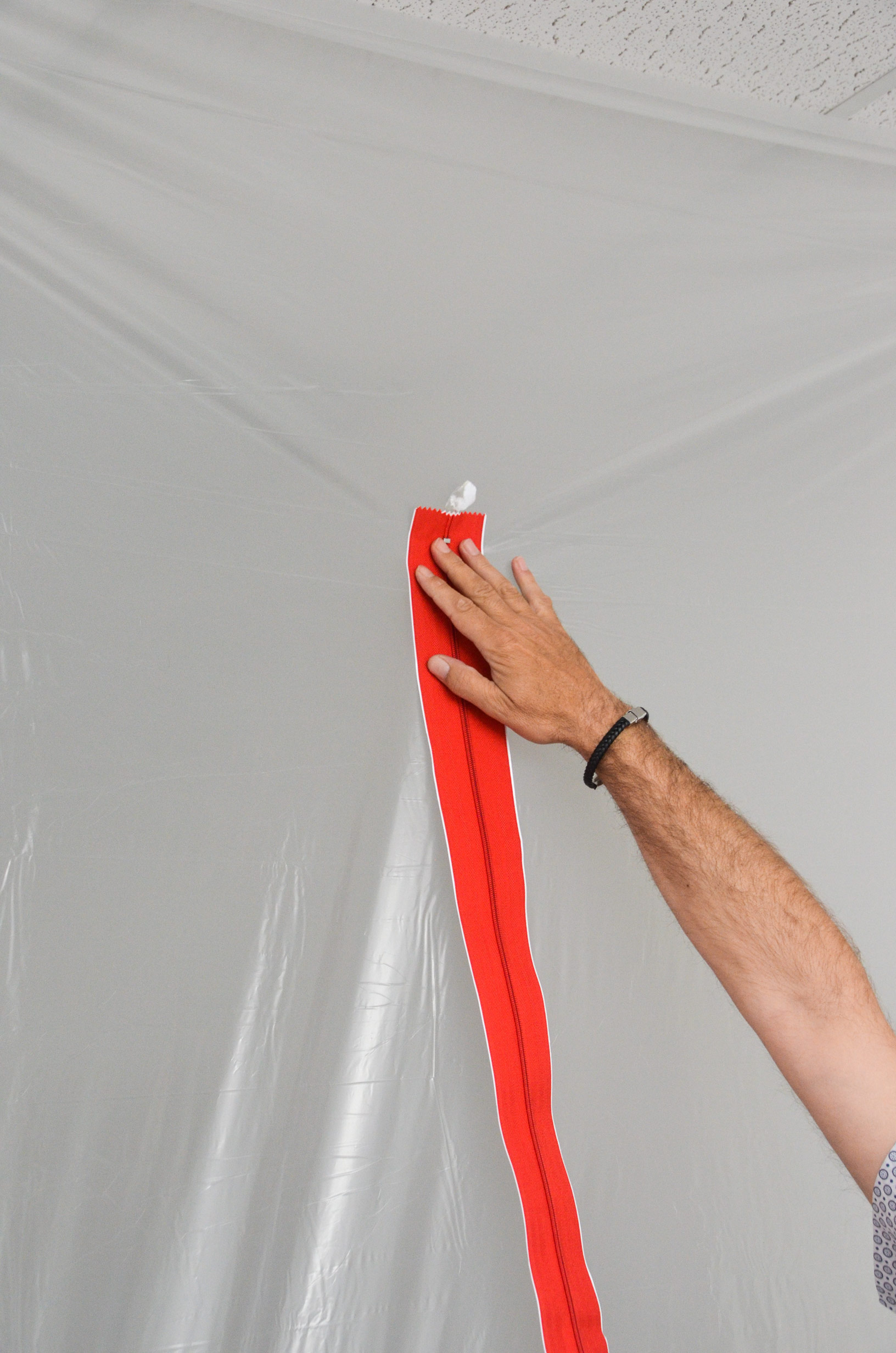 Die Abdichtungen zur Decke und Wand erfolgen mit den Alu-Schaum-Dichtschienen ZipWall® FoamRail™ auf der jeweiligen Seite. Eine zusätzliche Verklebung der Folie an der Decke und Wand entfällt somit.